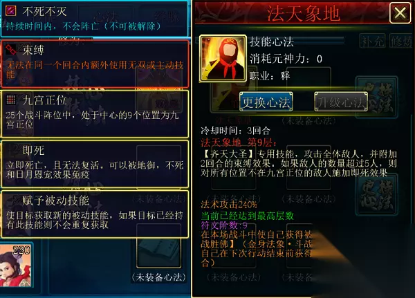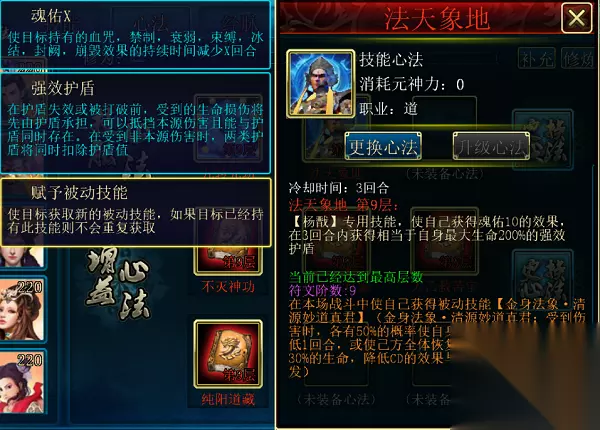 法天象地(杨戬专用,道):使自己获得魂佑10的效果,在3回合内获得相当于自身最大生命200%的强效护盾。CD3回合。符文效果为:在本场战斗中使自己获得被动技能【金身法象·清源妙道真君】(金身法相·清源妙道真君:受到伤害时,各有50%的概率使自身全部主动技能的CD降低1回合,或使己方全体恢复相当于杨戬最大生命30%的生命,降低CD的效果与恢复效果可以同时触发)(满级属性)