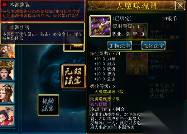 法象秘术(元神需求730):物理攻击+30000;法术攻击+30000;生命+100000;法抗+600;身法+1230;反击+600;坚韧+600;(满级属性) 天魔噬魂弩(被动法宝,通用):使用主动技能后,对单体敌人先附加1层本源撕裂,之后造成相当于其最大生命3%的本源伤害,己方每阵亡一人,就可以多造成3%的伤害,最多造成最大生命30%的本源伤害(满级属性)