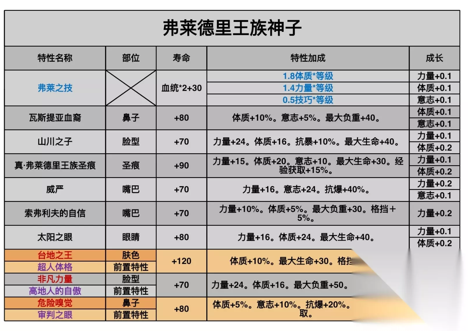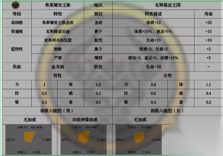 可以看到在神子中转为天启最普遍的牛头,王血首先是对体,力进行加成,其次略微对技进行了加成,并没有直接对感意进行加成。但是他的血统特性的百分比特中有少见的意志加成。 接下来是神特图