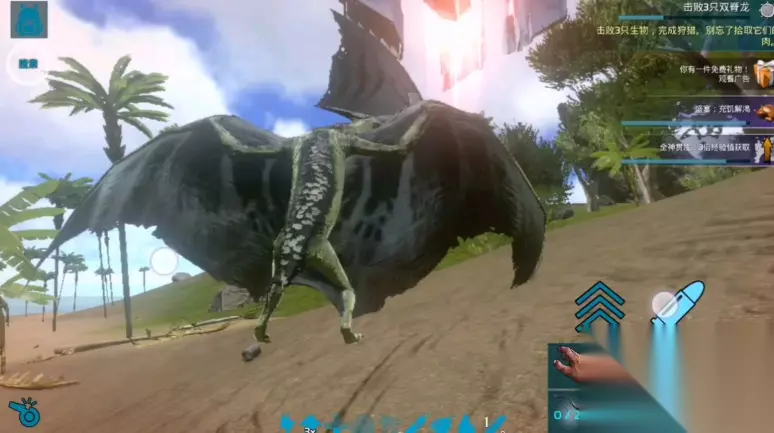 驯服后的古神翼龙能搭载三个人,负重共享所以要加点负重属性。它最特别的能力是可以攀附在悬崖和树干上,这时候咱们能在它背上使用远程武器,是绝佳的移动射击平台。记得给它配备平台鞍,97级就能解锁制作。麻醉镖比麻醉箭效果更好,有条件的话推荐用长管步枪配合麻醉镖。