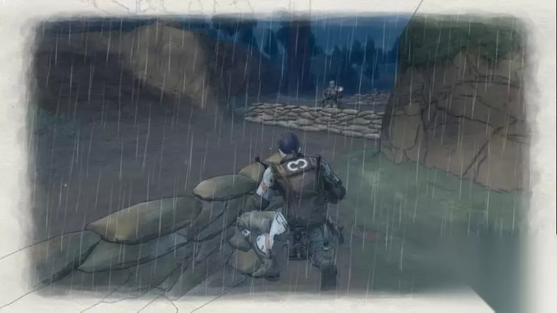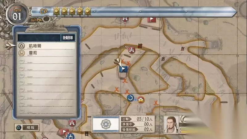轮到敌人的回合,敌人会出现一群增援。 随后控制凯伊将左侧的敌人先消灭掉,再沿着右侧有棵树的小路直走。 绕到一名敌人后方再消耗一点CP将其击杀后前往悬崖边的沙包处躲避即可结束回合。