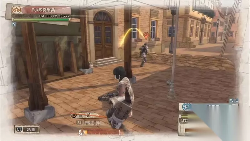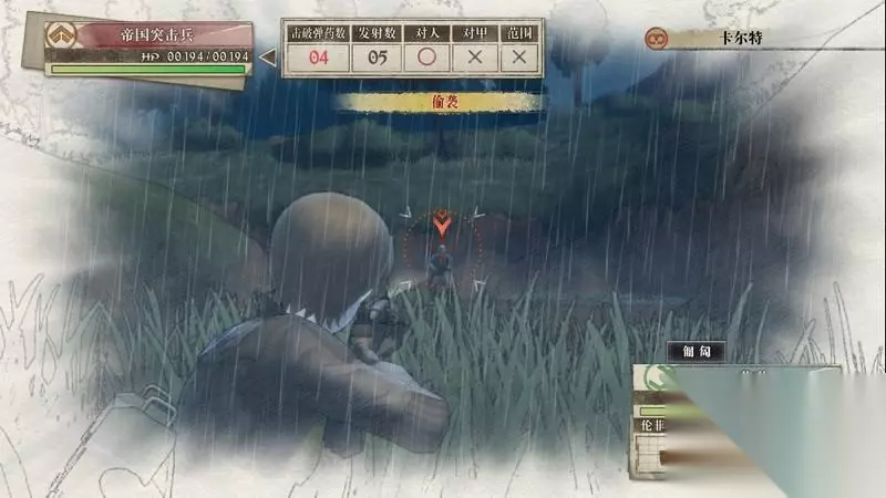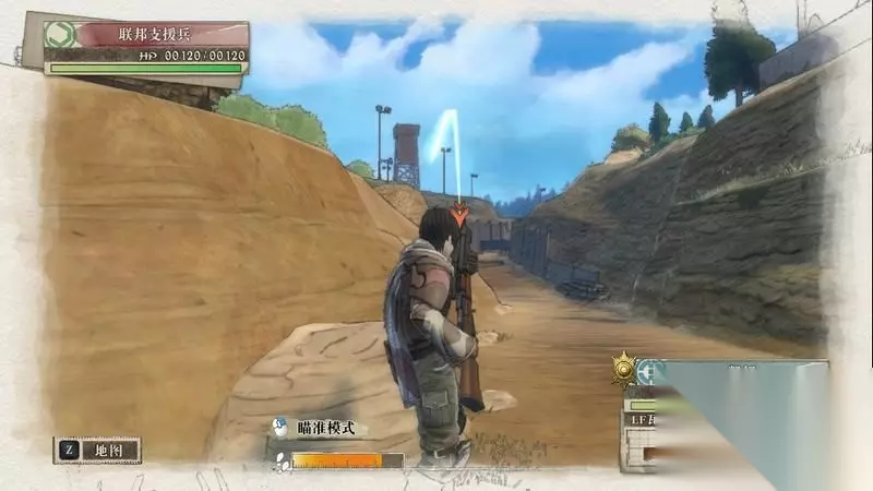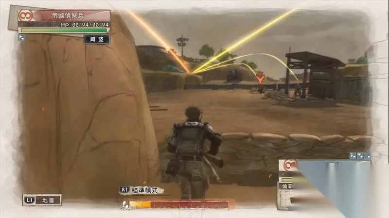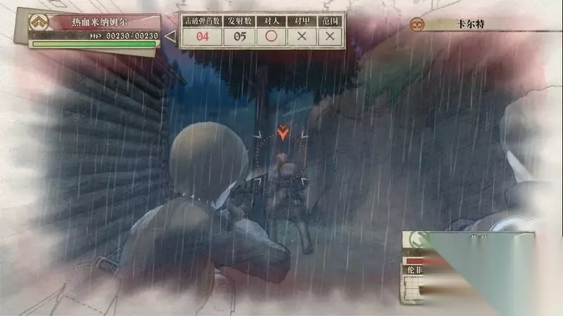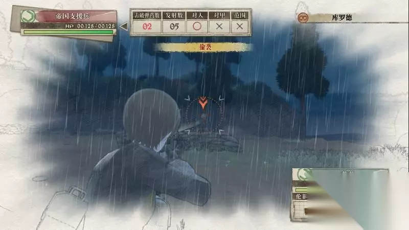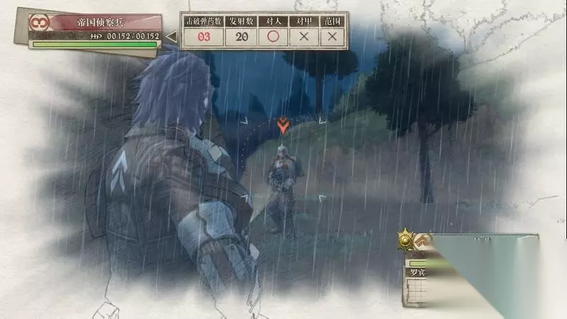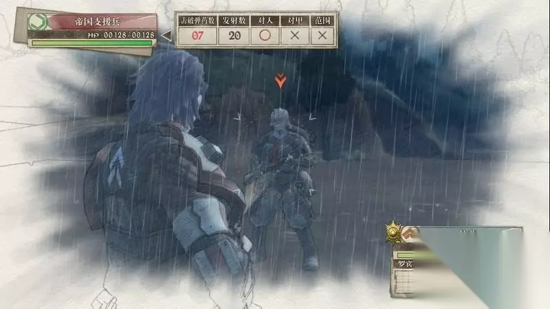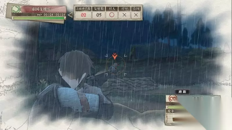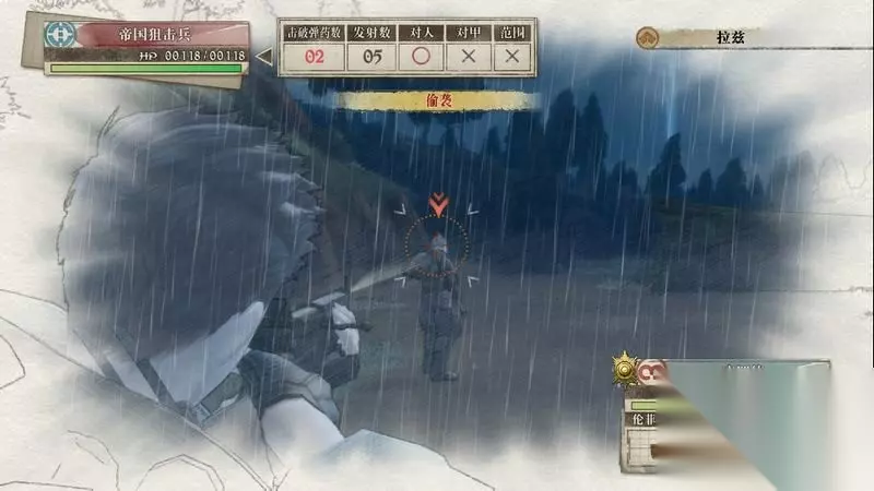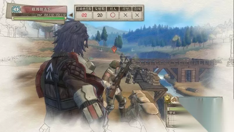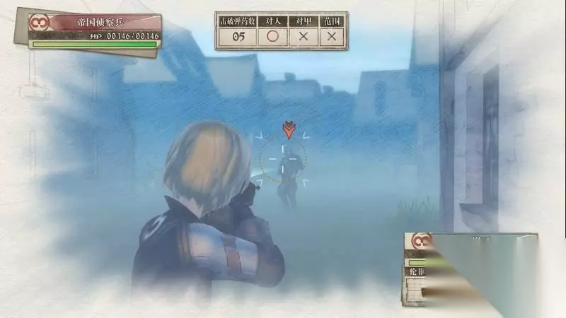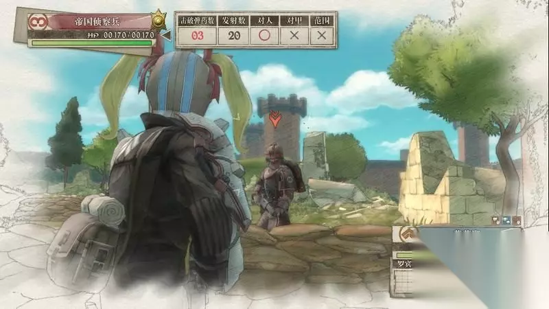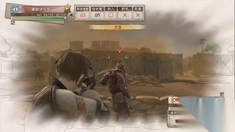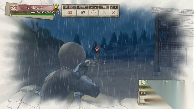 因为游戏中有奖杯需要玩家的队员达到最高军衔,除了主力队员外,一般队员开始并没有最高军衔。 因此,除了刷军衔的任务来提升军衔外,笔者这里尽量使用一般队员进行攻击获得军衔等级的提升,这里就选择妮可来进行射击。 控制妮可到第三个敌人面前爆头即可击杀最后一名步兵。