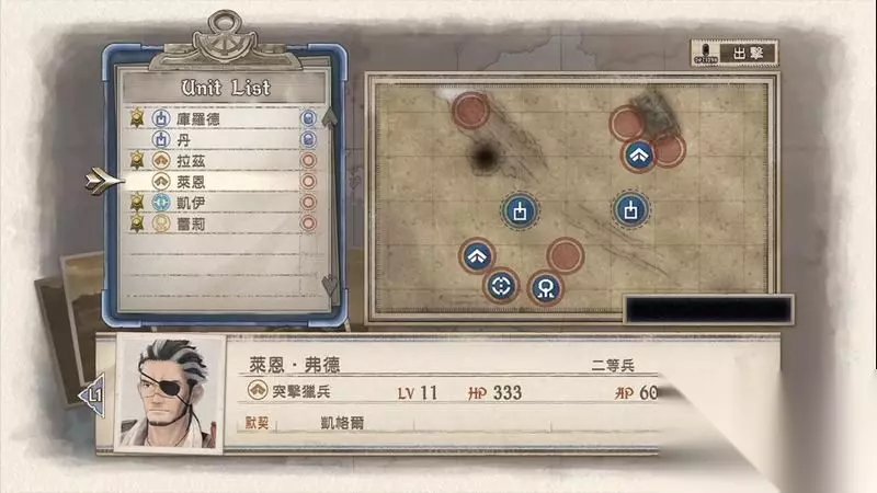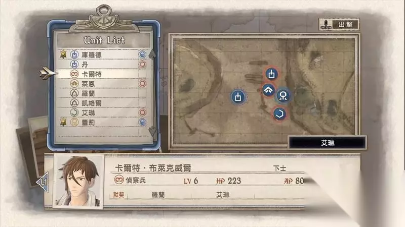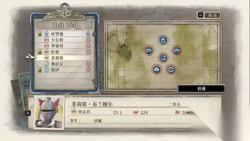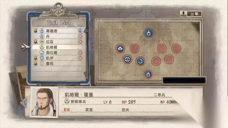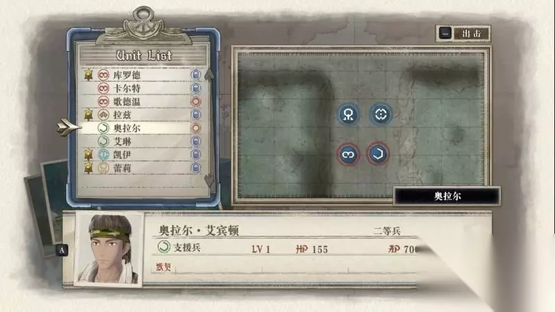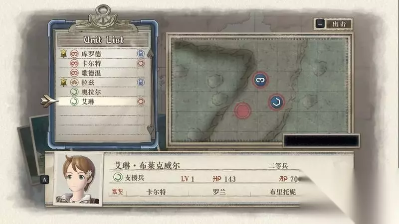 先开始编制部队,笔者这里搭配两名侦察兵、一名突击兵、一名应援。 另外凯伊和拉兹是作为突击和狙击必定出场作战的。 其中卡尔特作为侦察兵出场是有目的,因为需要他濒死过一次后可以招来一名艾琳角色登场加入战队。 阵型搭配如图所示,预备一名突击兵作为后备使用,其余全部上阵。