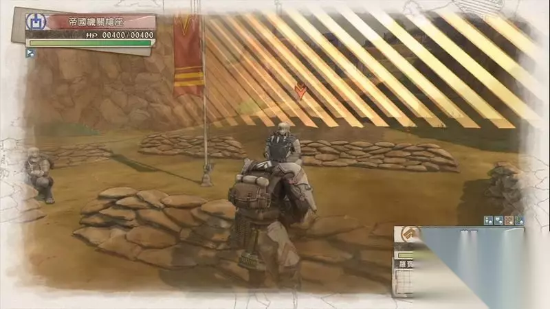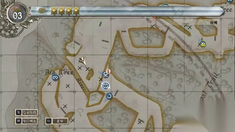来到第三阶段,需要在第8回合内占领最后一个据点。 这里拉兹终于听指挥了,先控制拉兹来到地图北边的敌方炮兵阵处,将剩余的两点CP解决掉两名炮兵。 解决掉炮兵后,在炮兵背后的草丛处匍匐躲避敌方的行动回合。