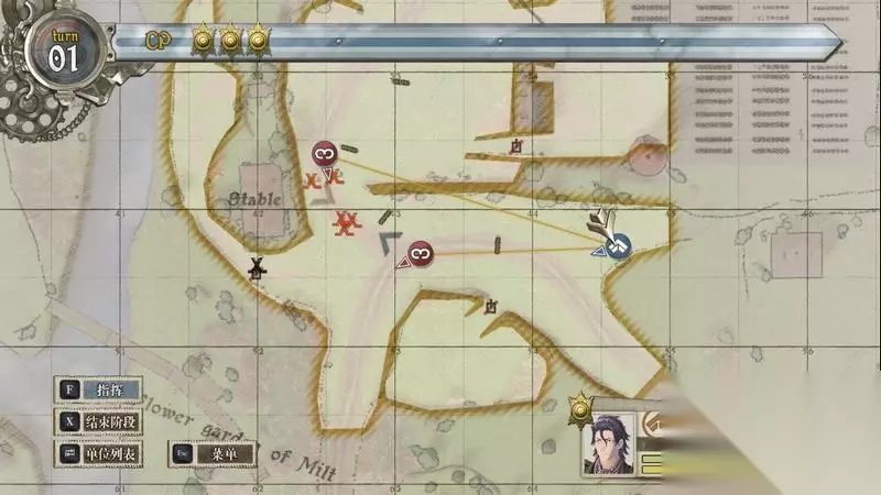 开始后,先出动凯伊直接指令带上梅贝尔,一路直走来到右侧小巷,顺便击杀斜左侧的敌人。 随后控制梅贝尔将右侧的敌人据点击杀并占领据点。