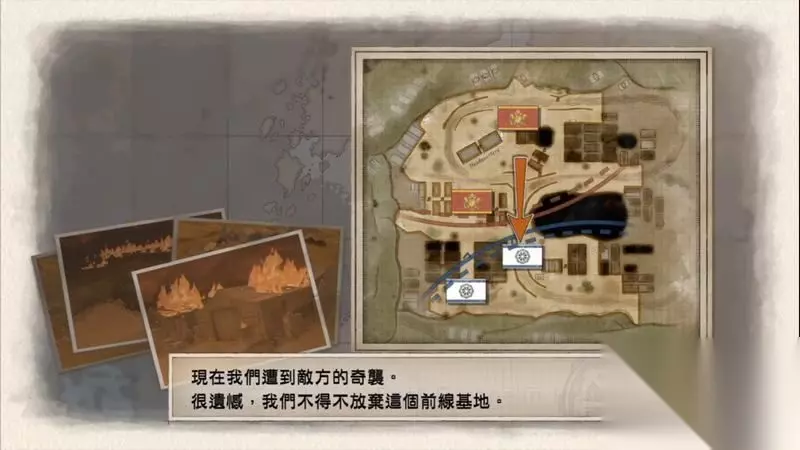 接下来将仙人掌号旁的狙击手和支援兵分别搭乘上车。 控制仙人掌号往左侧岔路走,并将远处的油桶击爆。 再消耗一点CP从火海中穿过去,击杀据点敌人,并将狙击手放下占领据点并上旁边的高台侦查到火山号即可。 占下据点后,获胜目标会变更进入第二阶段,敌军会出现增援。