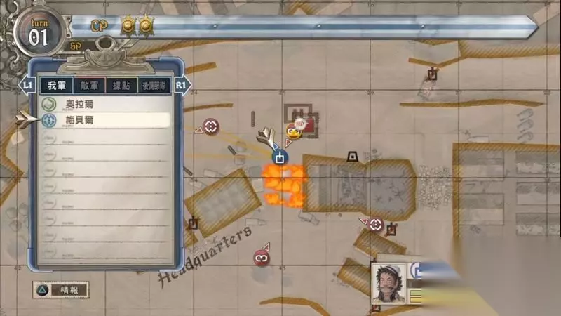 控制拉兹向破坏掉的障碍物的位置行动,将该障碍物处的敌人击杀。 随后再消耗一点CP穿过障碍上楼梯来到上方据点,击杀掉据点的一名普通敌人。 再行动一次尝试连杀到��涅耳瓦并让他的背后朝向右侧沙包处。