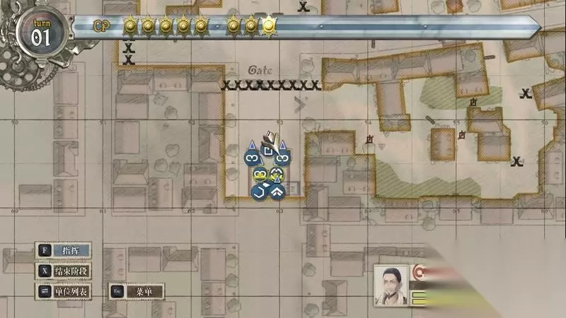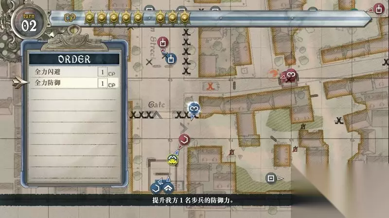 到这里后,基本上轮到敌人的回合了,敌人会把原先占领的据点夺回来,其余的行动无法对我们造成大影响。 轮到我方回合后,为了以防万一,可以给开大门的侦察兵加上全力防御技能。