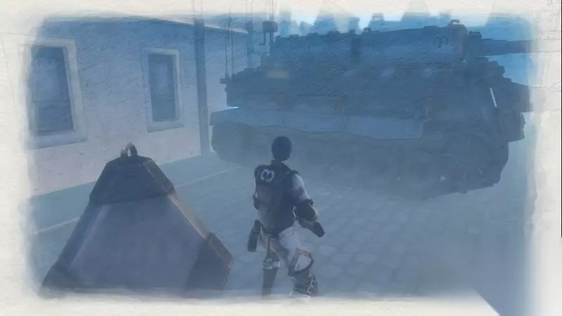 接下来控制海芬号通过大门,在正前方的两名敌人中间投掷榴弹炮可以将他们直接击毙或击伤。 随后将海芬号斜向挡住第三辆坦克的对大门方向的火力输出即可。