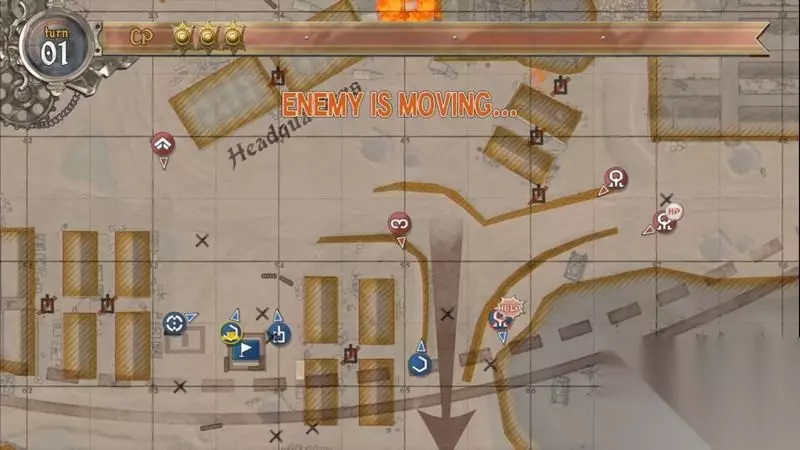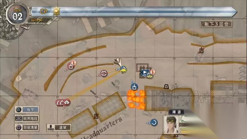 拯救了蕾莉后可以继续消耗1点CP控制该名支援兵前往火海处将房屋后面的敌人击杀掉。 到了第三回合,最后清理地图左上方的剩余目标,这里有一名狙击手可利用支援兵优先清理。 在左上角的还有一辆敌军战车,可以用突击兵加强破甲能力来及破掉,其余的可交给凯伊击杀掉即可完成S评价。