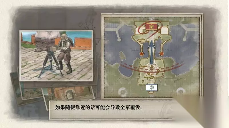 进入战场后,首先需要调动右侧我方兵力对左侧进行火力掩护,这里先使用卡尔特,往入口左侧走,注意躲避地上的地雷,随后右拐直走到左侧转角处。这里有一名炮兵需要秒杀掉。