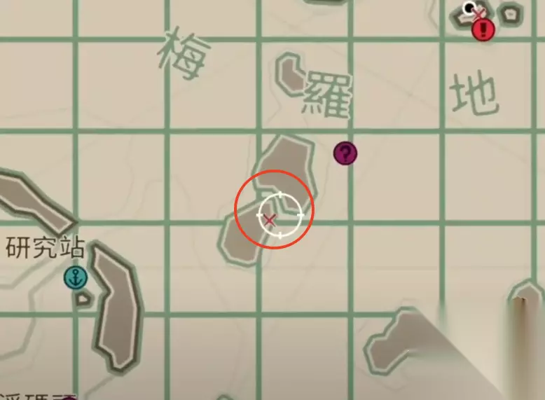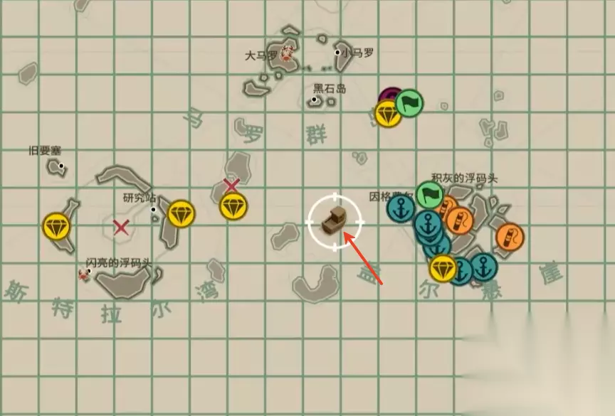 如图所示,这个点位有标记在地图上,大约是在H5和I5之间,刚好可以看到是2个小岛屿之间的狭窄航道。其实这个任务并不难,关键是要看值不值得,这里并不建议大家在夜晚期间特地跑那么远去做这个任务,可以任务先留着,后续到这附近的时候再顺手做一下。