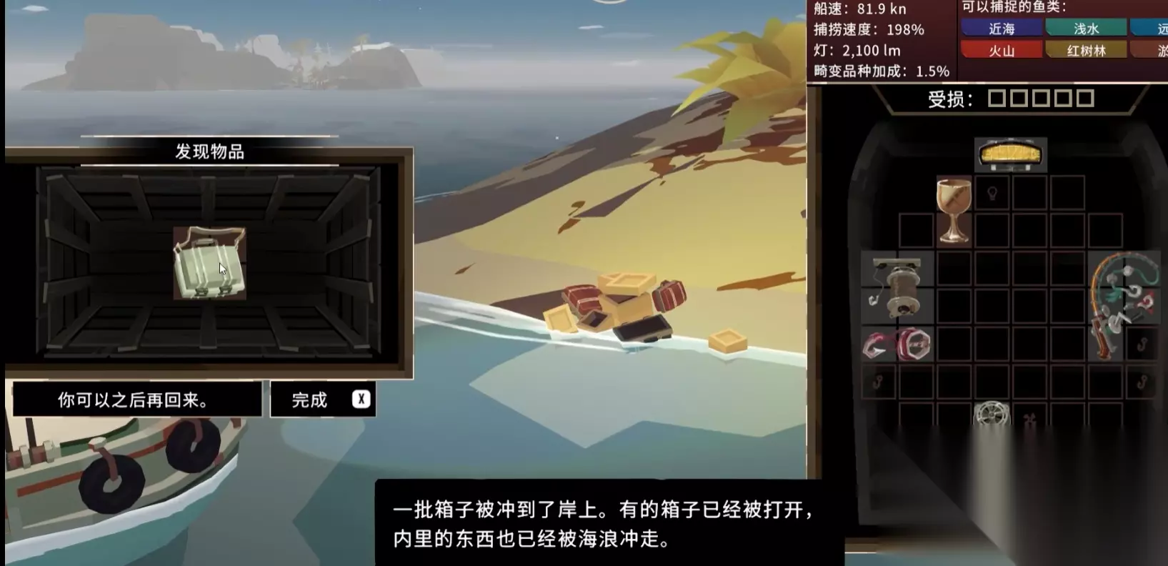 可以看到小岛的岸边有一个闪着光的箱子,将它带上回到之前摄影师的所在地,将其交给这个摄影师,就可以从她那里得到备用照相机,同时解锁技能“镜头”,用它可以拍摄风景。同时与这个摄影师对话还可以了解到附近海域的鱼类分布。