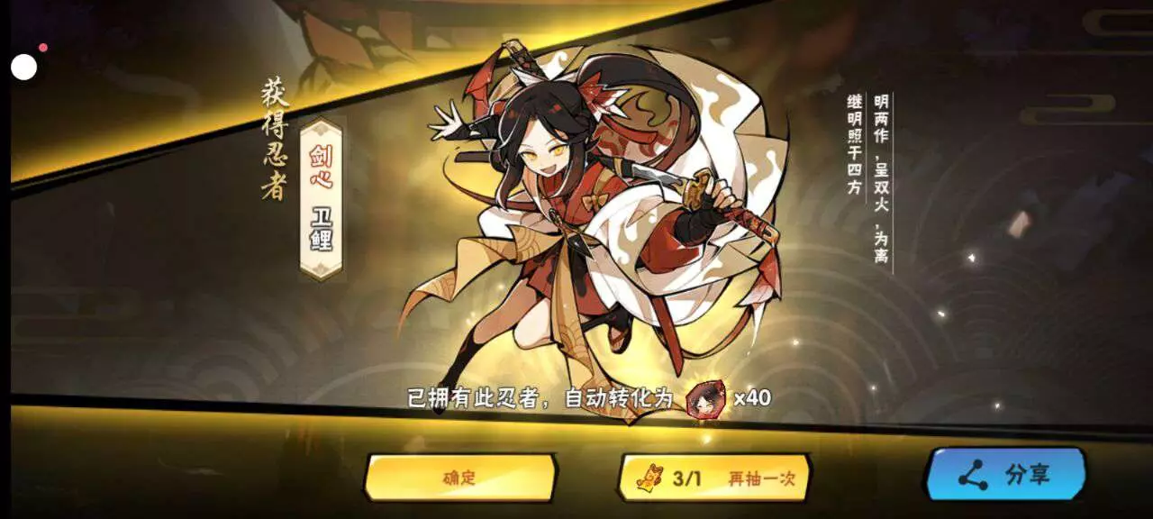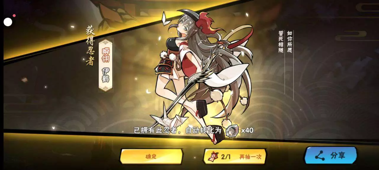 然后活动拿了三张符,单抽出忍者从来没有体验过的感觉耶!不会这两忍者已经把我这辈子的运气都用完了吧?不会我以后赌图卷永远都是300龙血吧?这种事情不要啊!(拿这两个碎片凑出来一只五命鹤和一只五命鲤)