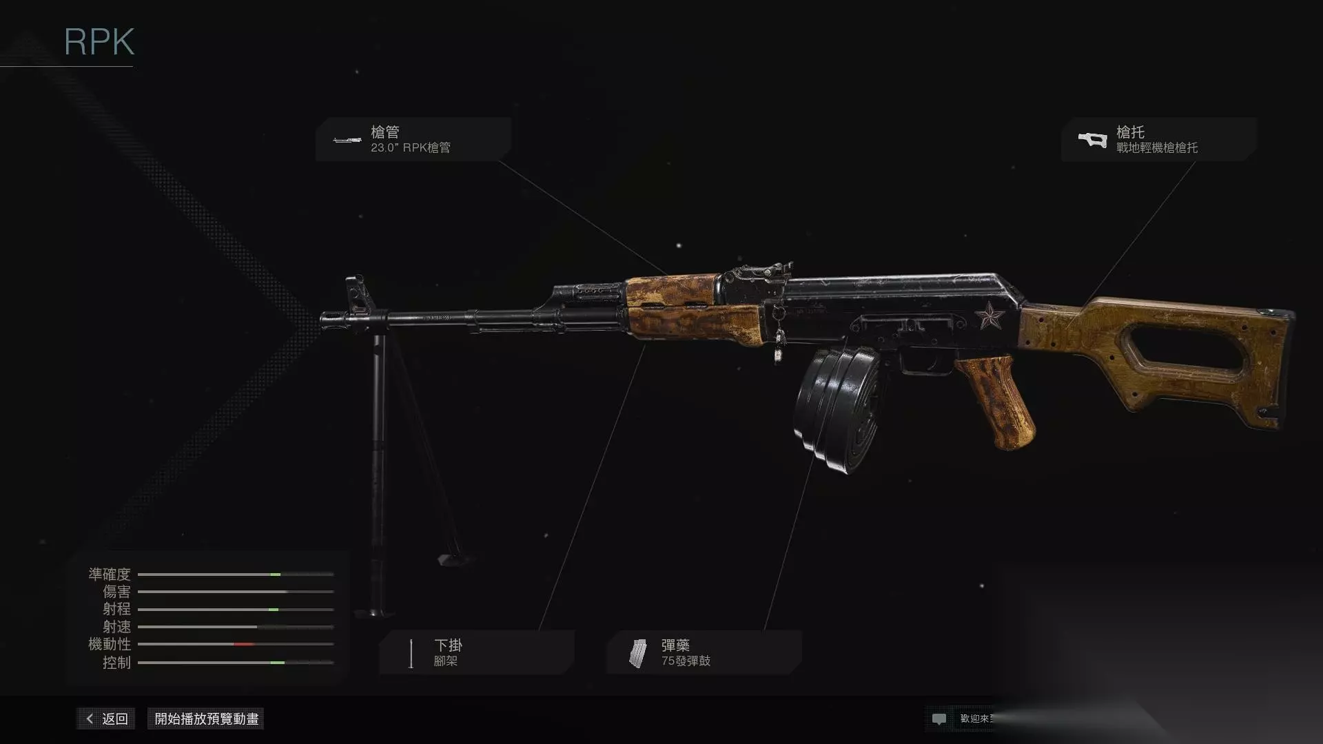 6.RPK 同样在AK-47的基础上使用RPK枪管、75发弹鼓、双脚架、战地轻机枪枪托可以改装成RPK轻机枪。RPK轻机枪本身就是由AK-47的衍生型AKM改进而成。