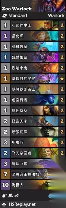 炉石传说术士怎么玩?HSreplay上胜率将近66%的一套术士卡组,很平民,只需要两张橙卡,而且是大多数术士卡组都有的两张橙卡,目前天梯4-1主要是战士、德和贼,以及少量的龙法、中速猎和其它。这套牌打德、法大优,打贼均势,打战士4-6开。不过可以趁着信息不对称上一波分。这就是炉石传说卡组飞毯园。 炉石传说飞毯园