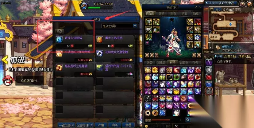 青龙大会的门票可以在小铁柱处获取,条件是使用50个红色小晶块和7个无尽的永恒,见下图: