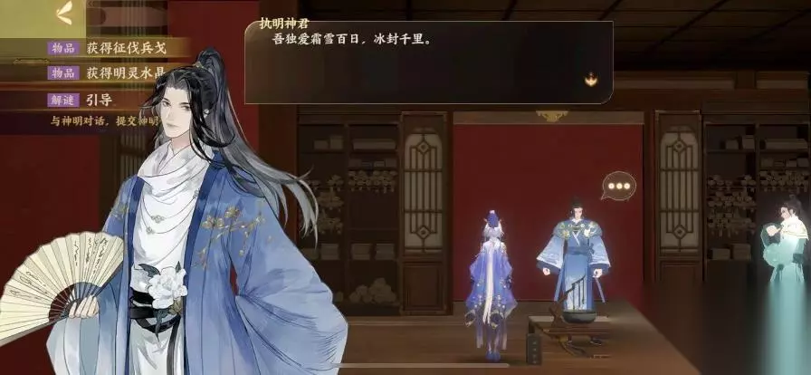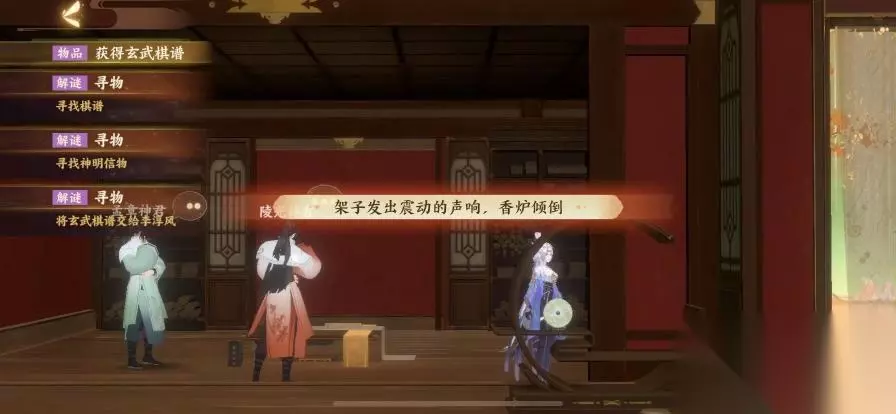 将朱雀棋谱交给李淳风,按照提示与陵光神君对话,回答问题,答案是鬼、柳,得到一个玉璧,将玉璧放在左边第一个屋子的架子上面,会得到玄武棋谱以及香灰,将棋谱交给李淳风,解锁与执明神君的对话,同样是回答问题,答案是二十五,得到寒冰之匙,来到左边最后一个房间,用寒冰之匙打开冰鉴,获得白虎棋谱。再次将其交给李淳风,然后按照提示与监兵神君进行对话,击败魇化士兵,得到花种。