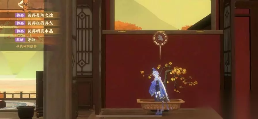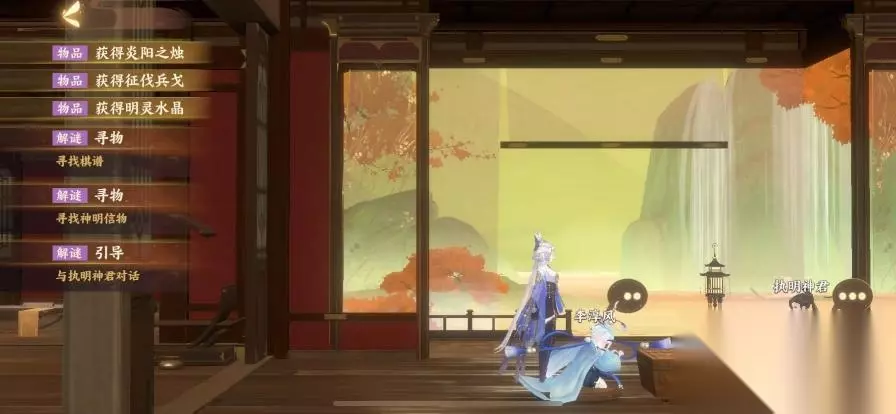 在右边第一个房间找到水壶,接着前往左边第二个房间,找到花盆,将香灰、花种以及水按照顺序放进去,得到孟章神君想要的长生神木。回到中间的大厅,在阳台的灯罩里面获得陵光神君想要的炎阳之烛。