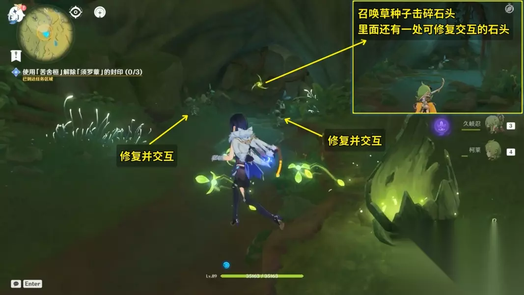 12.使用「苦舍桓」解除「须罗蕈」的封印 修复并交互三处破损的石头。