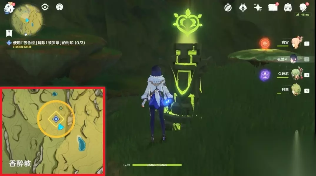 4.使用「苦舍桓」解除「耶然草」的封印(3处) 兰纳迦「苦舍桓」的能力是让水中的平台抬升起来,从而可以让你与封印石交互。 这三处封印都有绿色光芒提示方向,比较好找。 其中,下面这一处封印需要先召唤草种子后用弓箭射击三个草靶子,解开绿色屏障。