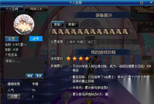 从官网和体验服的内容来看,点开之后会有个人空间和同城交友两个部分。个人空间会展示自己的装备、个人信息及角色数据等信息。 从面板来看,会包含自己什么时间进入游戏,有多少个角色以及参与团队副本的次数,