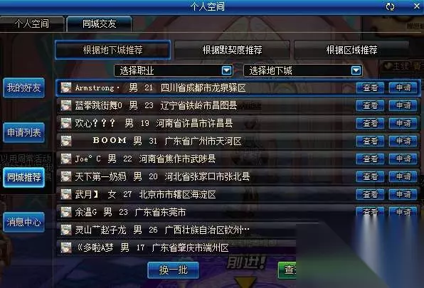 而同城交友这个功能就非常厉害了,可以在页面筛选人员并添加为自己的好友。 可以看到上方有3个选项,分别是根据地下城推荐、根据默契度推荐、根据区域推荐。顾名思义,根据地下城就是通过地下城区域来推荐伙伴,默契度即为平日的游戏方式,区域就是同城同区域。