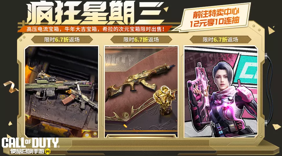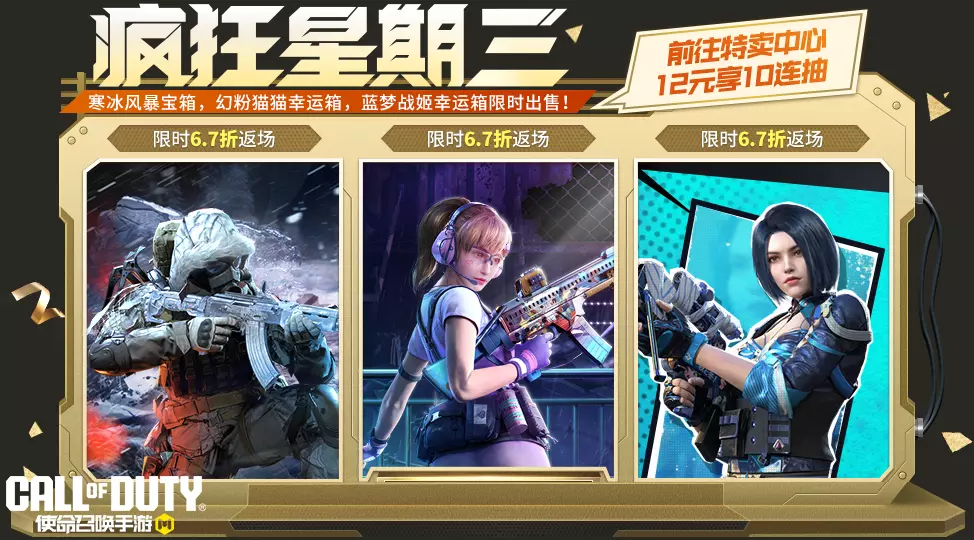 疯狂星期三活动期间,战士们将享受6.7折的超值福利优惠。本次返场的三个宝箱各拥有一次特惠十连抽体验,战士们前往“特卖中心”,花费12软妹币即可十连抽一次!