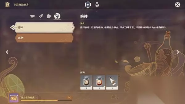 1、晚钟配方:咖啡×1、红茶×1、牛奶×1。暮色配方:红茶×1、果汁×2。 2、搅拌咖啡、红茶与牛奶,使其充分融合。不仅口味丰富,对提神和恢复体力也很有帮助。 3、红茶类配方:学士的午后:红茶×2、牛奶×1。明冠:红茶×1、牛奶×2。欢声笑语:红茶×1、牛奶×1、可可酱×1。酸沁光辉:红茶×2、柠檬×1。烟霞蔽芾:红茶×3。情诗:红茶×1、牛奶×1、焦糖酱×1。 免责声明:以上内容源自网络,版权归原作者所有。如有侵犯您的原创版权请告知,我们将尽快删除相关内容。 总结一下,阅读完小编整理的这篇晚钟原神配方的内容后,希望玩家们能够顺利地掌握游戏技巧,快速上手并畅玩游戏,如果还有其他游戏问题,可以关注本站的内容更新。