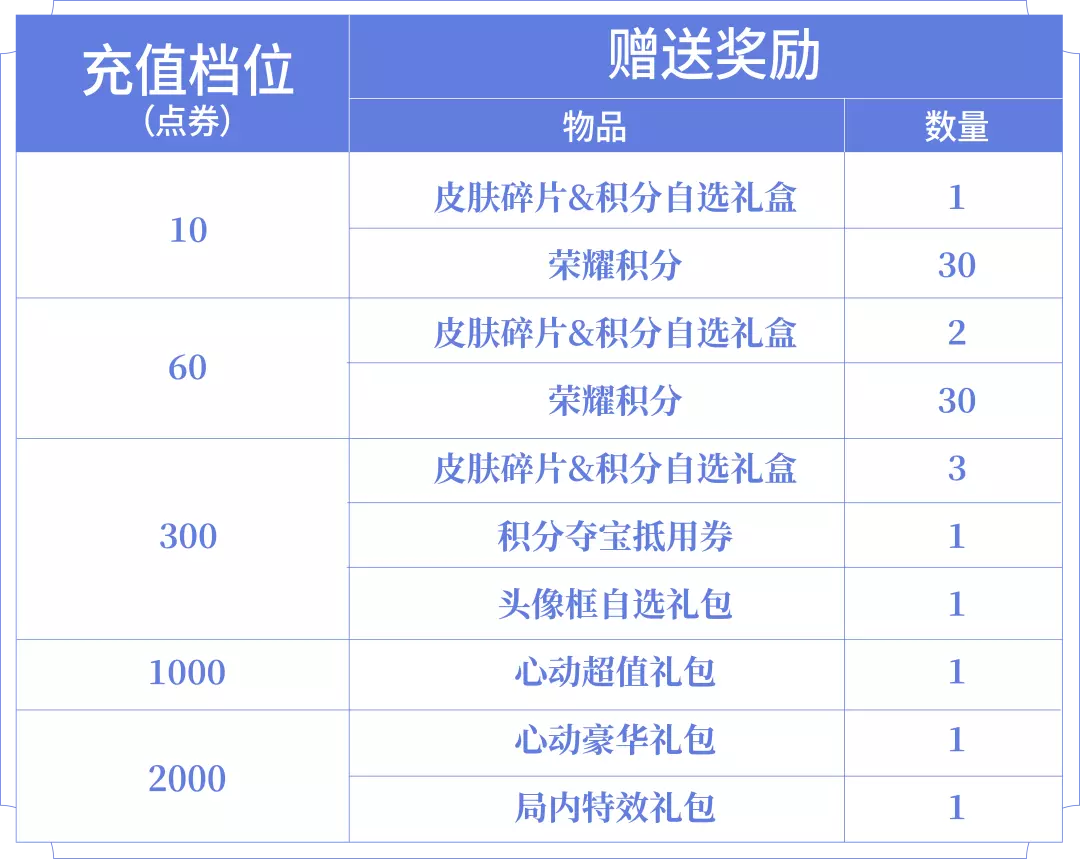 ⧫皮肤碎片&积分自选礼盒:打开礼包可任意选择以下奖励之一:荣耀积分*10或皮肤碎片*1