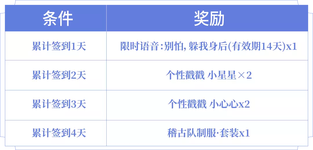 累计签到即可领取限时语音、个性戳戳、稽古队制服·套装好礼!