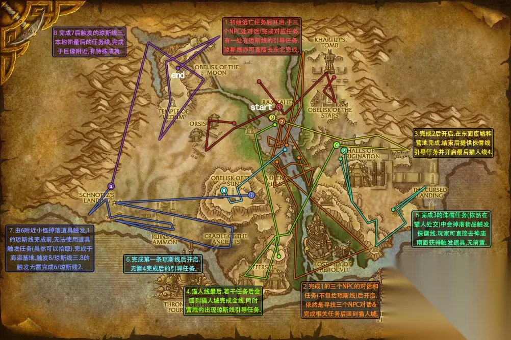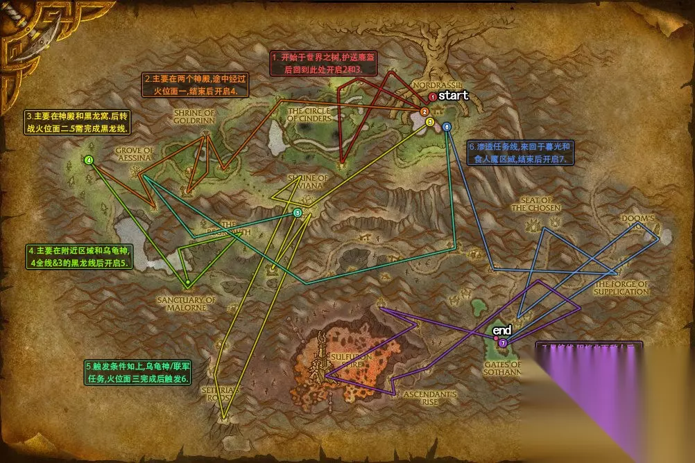 魔兽世界ctm升级是非常重要的,今天给大家带来的是游戏里面ctm怀旧服80-85攻略,还有很多的小伙伴不清楚80-85要怎么升级,那么下面就是具体的内容. 魔兽世界ctm怀旧服80-85攻略 海加尔山(80-82级) 任务升级相关信息 玩家角色到达80级后即可去暴风/奥格瑞玛主城中央告示牌获得前往海加尔山的任务。任务流程示意图 start代表起始任务,end代表全图任务线终点(可能有若干零散任务,不作考虑)。单独的小圈终点表示该任务线终结于此。 线段仅代表大概行进方向和任务区域。