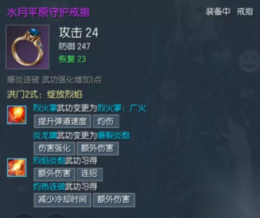 气功师的核心装备为戒指,这里推荐佩戴水月平原守护戒指。用了后可以将烈火掌变成为广火,提升范围伤害以及弹道速度。另外其他方面的技能,也能增加额外伤害提升。另外攻击力也高,又能强化武功。有了这个戒指之后,推荐学习火属性功法,伤害进一步提升。