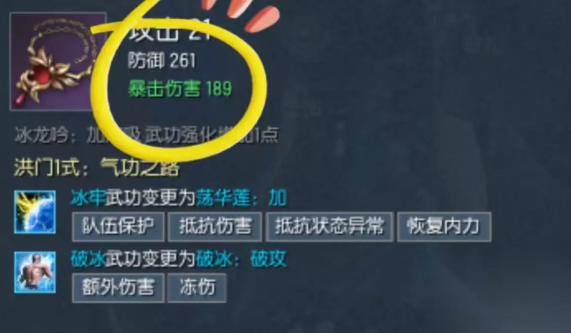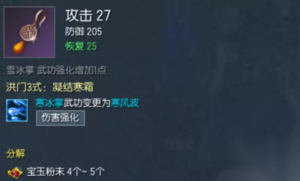 至于气功师的耳环,这里推荐佩戴觉醒恶女耳环。同样能够增加攻击力,防御力和恢复速度。能够将寒冰掌武功进化成为寒风波,伤害变得更高。暴击之后可以恢复内力,这时候我们一定要买技能,并将其作为核心输出技能,伤害才更高。