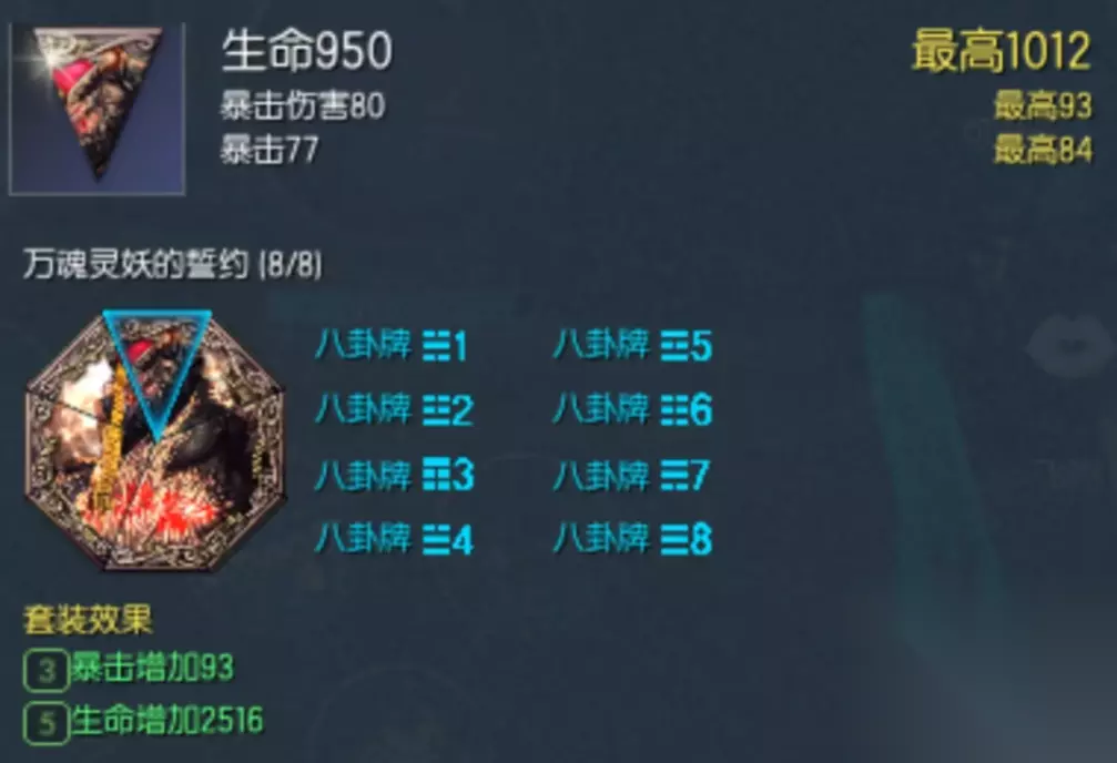 接下来就是八卦牌,八卦牌的话直接用万魂八卦牌就好。精气也不用自己打了,在拍卖行买个200个精气转转盘就好了。八卦牌属性选择暴击爆伤或者带穿刺的就好,要是只有爆伤也行。套装效果的话最好也是增加暴击,一整套搭配下来的面板非常豪华。暴击伤害甚至高达1200多点,另外穿透率也高达1000,总之刷本基本够用。