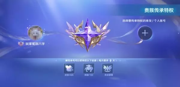 3、当我们想要传承,并且有这种资格的好友玩家时,到达贵族传承特权面板。 4、选择符合条件的亲友或者账号,点击加号选择,添加后的好友可以想用贵族账号中的皮肤、英雄和勋章。 5、但是每个月最多只有8天的资格,超过将不会生效,传承内容也有数量限制。 【小编推荐】专区入口 || 视频站入口 || 体验服申请入口 || 全民竞猜赢好礼 【新英雄爆料】| 司马懿 || 瑶 || 孙策 || 新英雄:囚徒/书圣/瞬 | 【新皮肤爆料】| 李白团战皮肤:敏锐之力new || 诸葛亮团战皮肤:掌控 || 典韦穷奇皮肤 Hot!! | 王者荣耀最新攻略 赛季段位继承表 每日一题 边境突围玩法攻略 体验服爆料