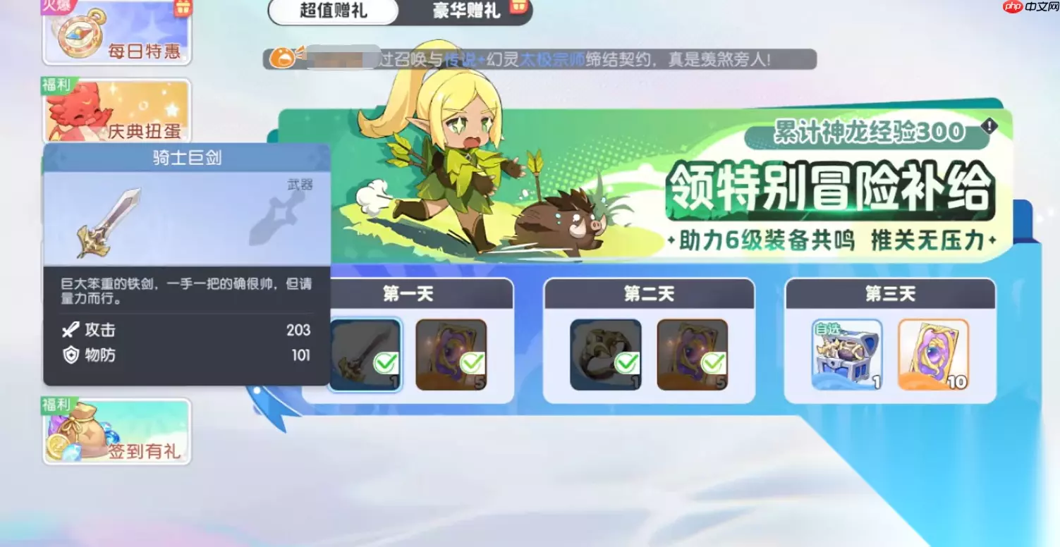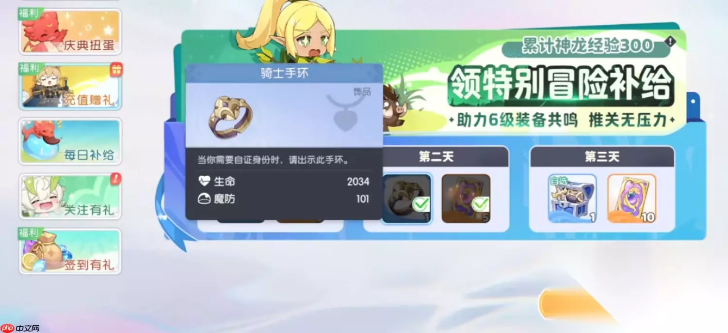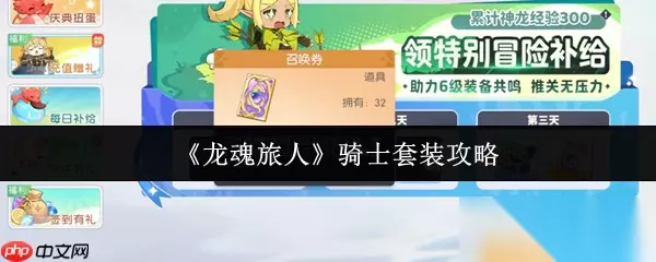 五、获取方式:充值活动专属奖励 如此强力的套装,自然不是通过普通副本掉落就能获得! 唯一途径:骑士套装仅能通过游戏内的“充值赠礼”活动获取。具体机制如下:玩家需通过充值积累积分,当积分达到特定档位后,即可在活动开放的三天内领取对应的装备部件。这种方式省去了刷图掉率的烦恼,让你快速入手顶级装备,开局即强势! 结语: 《龙魂旅人》骑士套装,就是为前中期称王称霸而生的终极答案!它以夸张的生命值、均衡的攻防属性,彻底解决开荒期的装备难题。尽管需要一定投入(参与充值活动),但所带来的战斗力飞跃和游戏体验提升,绝对是物超所值!试想,当你手持巨剑,身穿全套战甲,血条如山般稳固,在战场上横冲直撞无人可挡——这,正是骑士套装赋予你的绝对统治力!别再犹豫,锁定活动,穿上你的战神铠甲,开启属于你的传奇征程吧!
