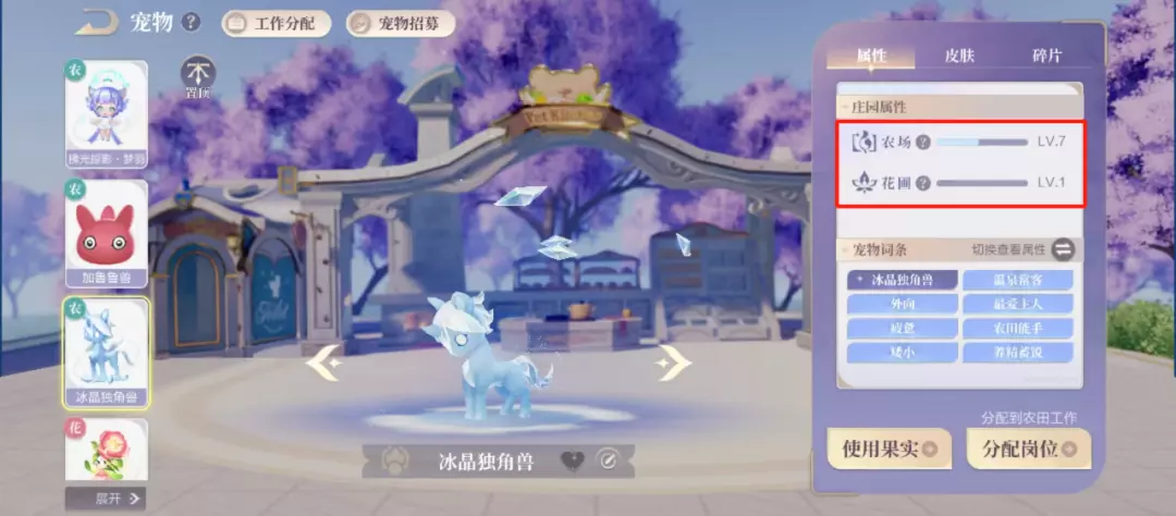 宠物在不同的工作类型上有不同的熟练度。随着收获农田/花圃可以获得经验,等级提升之后,宠物进行工作的速度会变快。