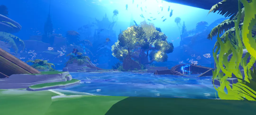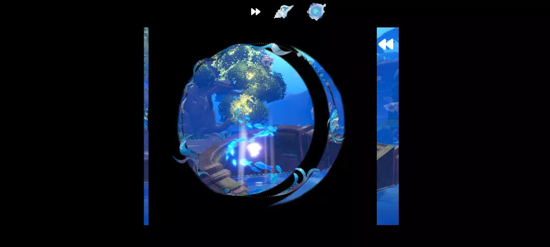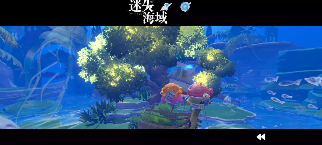 这个打卡点是地图中最美的打卡点哇,黑幕笼罩着周围,前边是一个正方形的边框,透出里面的蓝白色的海底世界,中间还写着字~