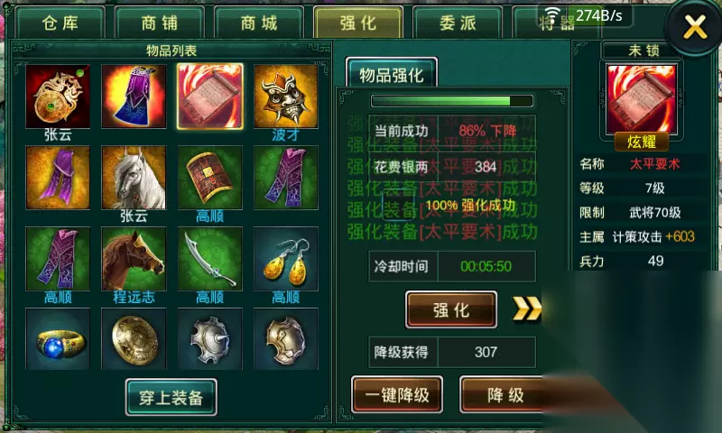 每天在酒馆有6次免费会谈的机会,在酒馆会随机碰到不同的人,碰到武将也是有可能,但是概率比较低,人品好也许就能碰上。但是除了武将,还能获得战功、银币、威望等,这些也是很不错的东西。5.强化: