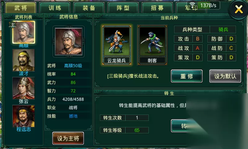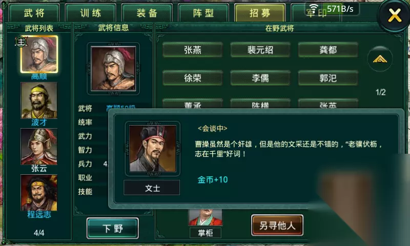 每天2次免费狩猎的机会。狩猎不仅可以获得金钱、战功、军令,还是能获得大量的经验。这里的提到的经验只有主将能获得,所以,当其他三个武将在训练的时候,用主将去狩猎,达到的效果就是四个武将同时成长。4.会谈: