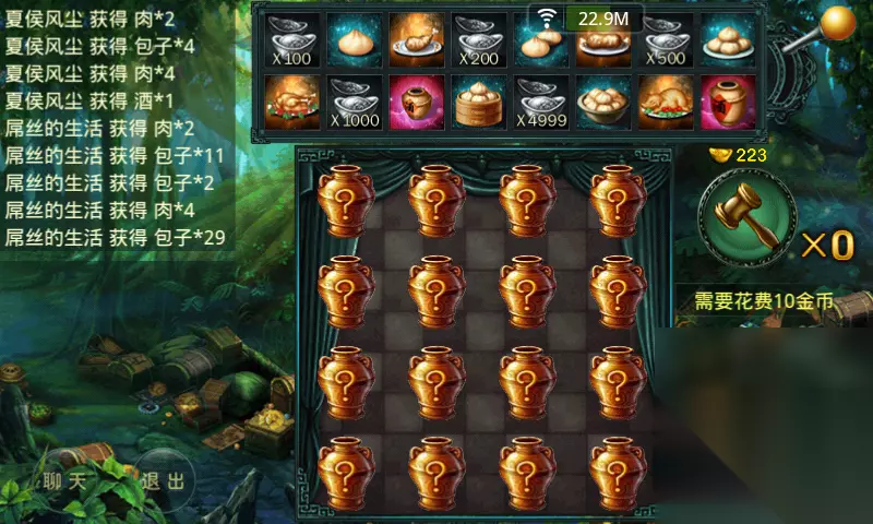 每天免费8次砸罐子的机会,可以获得出银币以外的包子、鸡腿以及酒,这些都是花钱也买不到的物品,却又是武将提升属性不可或缺的物品。3.狩猎: