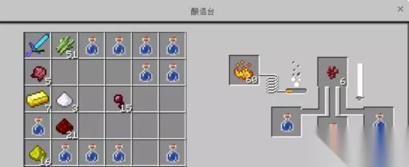二、制作过程 1.先将烈焰粉,下界疣,水瓶放入酿造台中,过一会水瓶就变成了粗制的药水了,这是一种没有效果的药水。 2.将下界疣取下来,换成金萝卜,同样等待几秒,就完成了夜视药水的合成了。