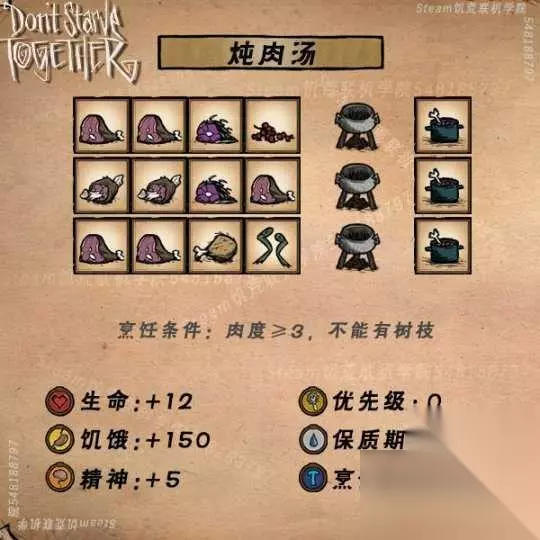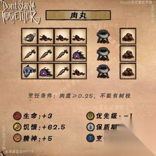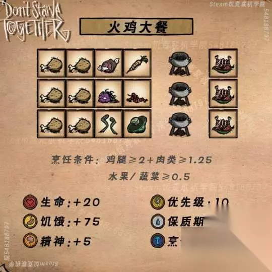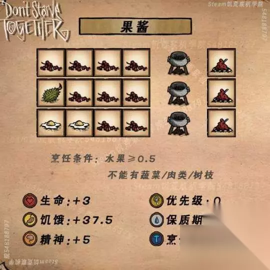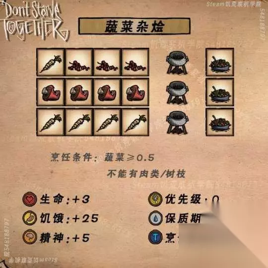 饥荒食谱大全配方图表(高清)最新导航: 1 .肉丸 2.炖肉汤 3.火鸡大餐 4.果酱 5.蔬菜杂烩 6.水果圣代 7.酿茄子 8.蛙腿三明治 9.蝴蝶松饼 10.火龙果派 11.蜜汁火腿 12.蜜汁卤肉 13.肉串 14.波兰水饺 15.曼德拉草汤 16.芝士蛋糕 17.南瓜饼干 18.什锦干果 19.怪物千层饼 20.炸鱼排 21.辣椒炖肉 22.太妃糖 23.冰淇淋 24.花沙拉 25.西瓜冰棍 26.华夫饼 27.培根煎蛋 28.鱼肉玉米卷 29.鳄梨酱 30.彩虹糖豆 31.失败料理 32.鳗鱼料理 33.舒缓茶 34.蔬菜鸡尾酒 35.香蕉冻 36.芦笋汤 37.花式回旋块茎 38.海鲜浓汤 39.酸橘汁腌鱼 40.生鲜萨尔萨酱 41.奶油土豆泥 42.爆炒填馅辣椒 43.加州卷 44.牛肉绿叶菜 45.素食堡 46.酿鱼头 47.叶肉糕 48.藤壶皮塔饼 49.龙虾正餐 50.藤壶中细面 51.海鲜大排档 52.藤壶握寿司 53.蘑菇蛋糕 54.龙虾汤 55.果冻沙拉 56.牛奶帽 57.琥珀美食 58.骨头汤 59.怪物鞑靼 60.芦笋冷汤 61.土豆酥 62.辣龙椒沙拉 63.鲜果卷饼 64.鱼汤 65.蓝带鱼排 66.伏特羊肉冻 67.梦魇派 68.发光慕斯 示例式卡片菜谱,1-57烹饪锅,58-68便携锅(厨师专属)菜谱