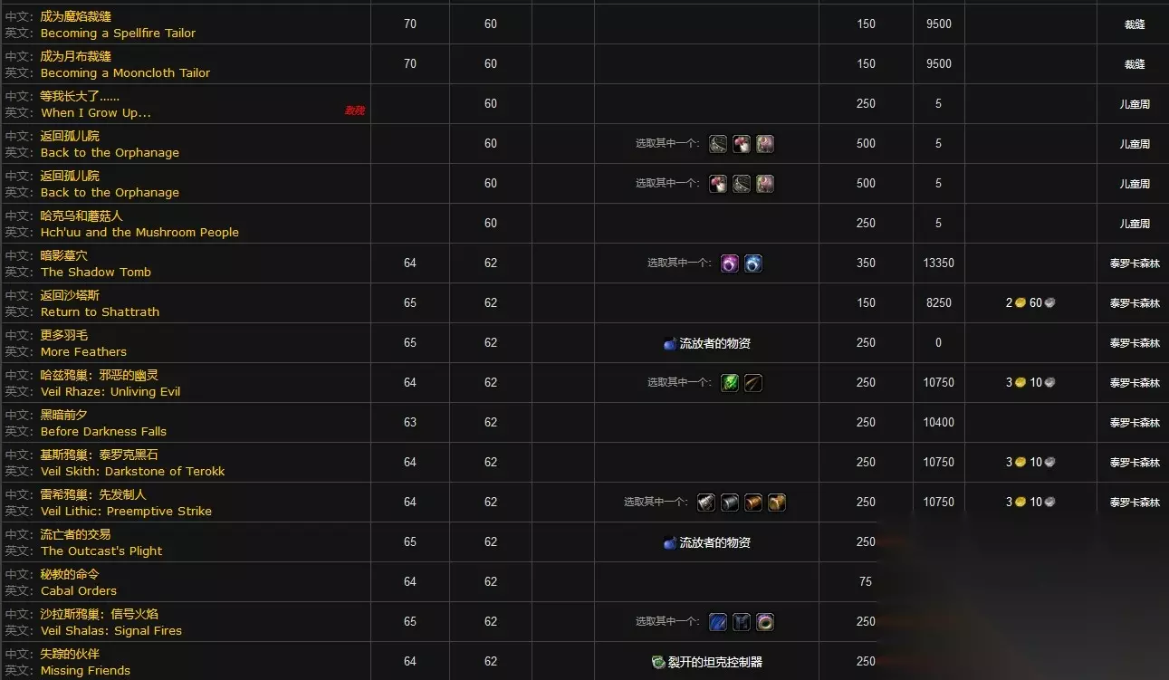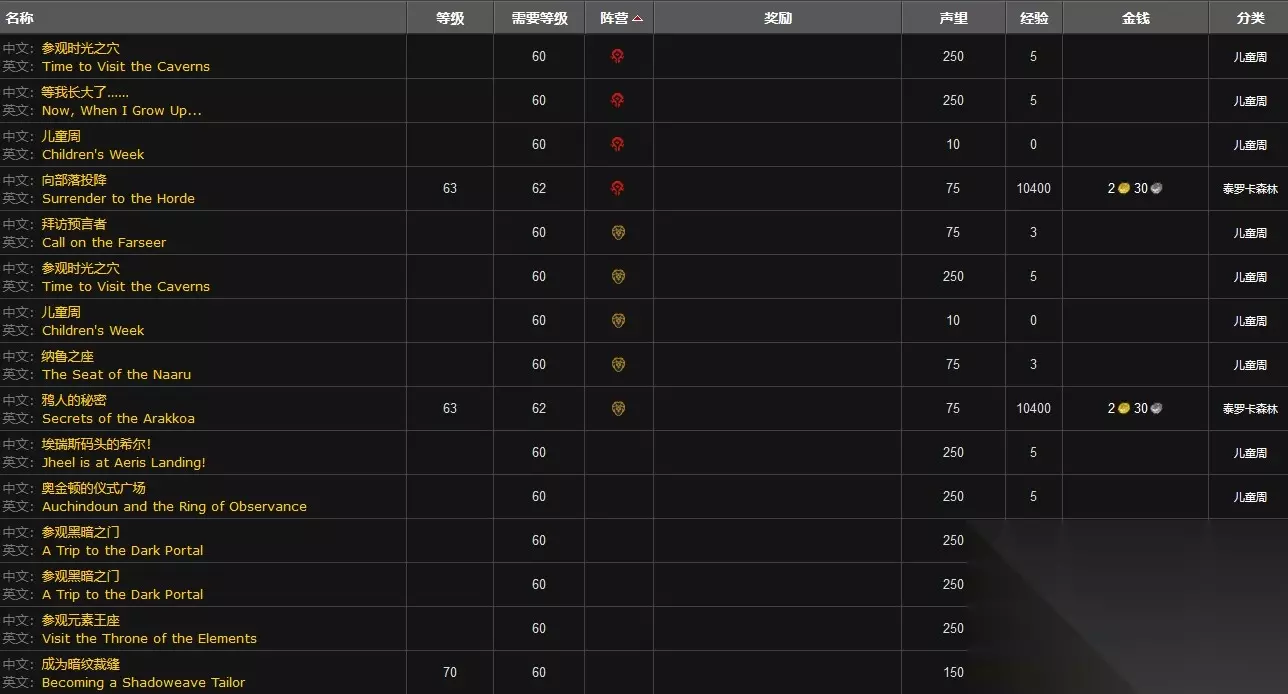 在魔兽世界这款游戏中,贫民窟声望任务有参观时光之穴、等我长大了、儿童周、向部落投降、拜访预言者、纳鲁之座、鸦人的秘密、埃瑞斯码头的希尔、奥金顿的仪式广场、参观黑暗之门、参观元素王座、成为暗纹裁缝、成为魔焰裁缝、成为月布裁缝、返回孤儿院、哈克乌和蘑菇人、暗影墓穴、返回沙塔斯、更多羽毛、哈兹鸦巢:邪恶的幽灵、黑暗前夕、基斯鸦巢:泰罗克黑石、雷希鸦巢:先发制人、流亡者的交易、秘教的命令、沙拉斯鸦巢:信号火焰、失踪的伙伴、斯克提斯的攻势、斯克提斯之眼、逃离墓穴、寻找基尔利克、不适当的葬礼、复仇的灵魂、呼唤英雄、击鼓、巨大的骨虫、迷失者的解脱、圣光之墓、收集骸骨、死去的主教、天空之翼、挖掘行动、兄弟反目、奥金顿的麻烦、灵魂装置、深入迷宫、鲜血法典、寻找间谍托古恩、药剂大师、悬赏:艾吉斯的冠羽、悬赏:恶毒导师、悬赏:摩摩尔的低语、悬赏:主教的灵魂宝钻。