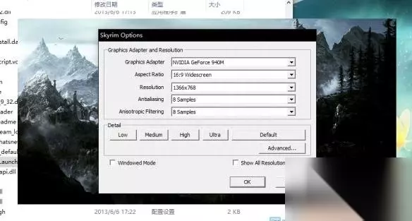 第二种方法:找到游戏的配置文件,路径是我的文档\MyGame\Skyrim\SkyrimPrefs.ini,将里面的bFull Screen等号后面的值改为1,下面的iSize H是分辨率的高,W则是宽,改成你的屏幕能够使用的分辨率就可以了。