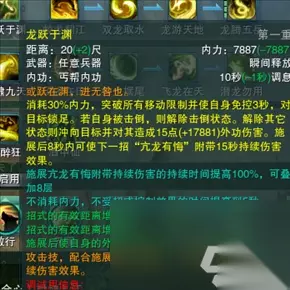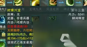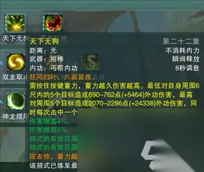 【亢龙有悔】所有连招中的核心技能。丐帮主要的伤害技能:雨龙奇穴情况下,也主要是靠亢龙有悔后的dot伤害,驯至奇穴情况下,这个技能可以配合其他buff,11层等。打出全职业惊人伤害。(打毕业奶,一掌17万)。 坚冰奇穴下,这个技能也是主要群攻伤害技能,这个技能也是最强的僵直技能,需要百分之50蓝才能用。终极技能,亢龙重在悔是因为这个技能打出去以后就没蓝了。如果说肾亏,那就是因为我们没练到家。 金老先生书里的洪乞丐说打出去10分力道,收回的却有20分!当然50蓝是技能本身要求。下面看看有关于这个技能的开发,奇穴等。