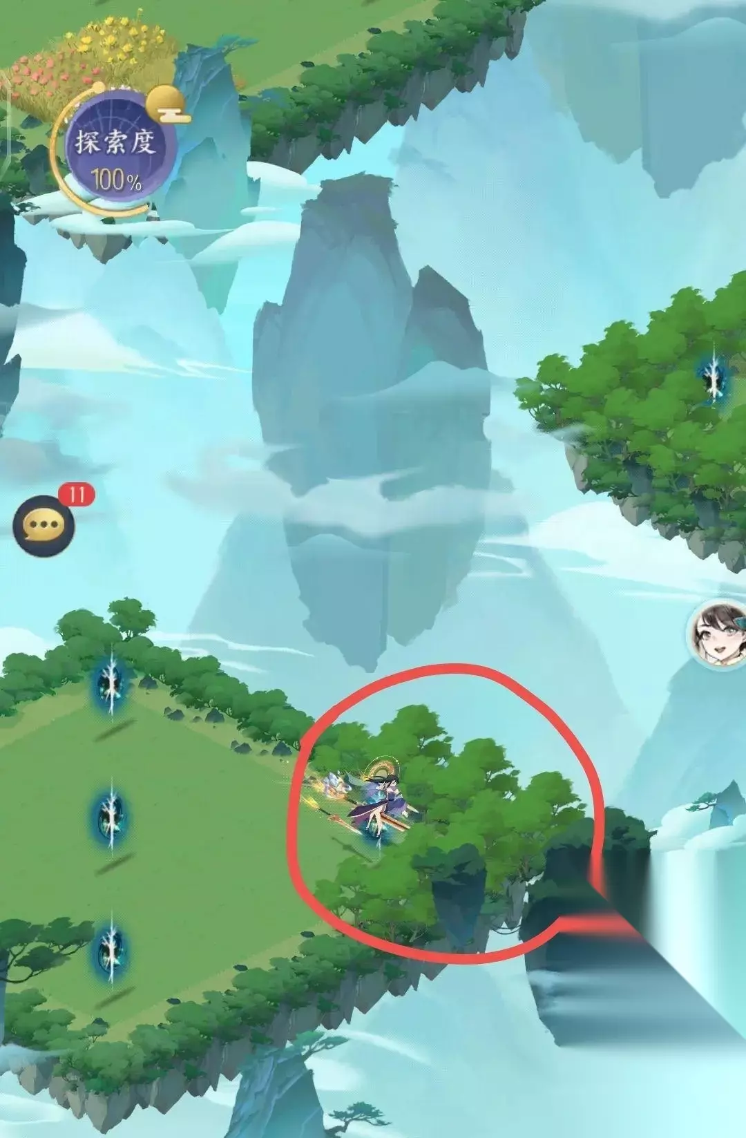 第三个比较复杂,先从11章的传送入口左边大树下找到三个宝箱和一座石像,开宝箱拿奖励,石像对话。接着npc严星云就会出现。