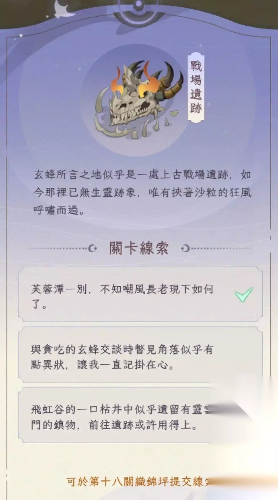 第三个飞虹谷,具体位置是在传送阵附近的枯井。最后回到第六章点击大剑,触发对话就能开启战场遗迹了。 第九章的天衍秘库。 第一个小任务玩家们如果前面的主线任务探索度有100%就可以。遇到卡探索度的问题可以试试探索灵泉,灵泉也算探索度。第二个第五章传送阵旁边的水池;第三个在罗刹宫,玩家们完成剧情就能得到。集齐之后来到传送阵,如图所示,对话后就能开启天衍秘库。