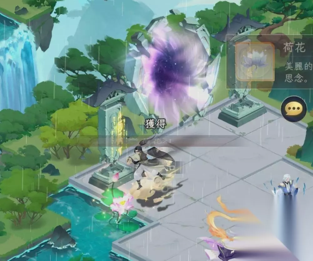 这个需要玩家们分别在第七章的芙蓉潭找到嘲风,多点击他几下触发了对话,就能得到族徽;第二个在织锦坪(第六章)中上方会遇到NPC玄峰,和他对话完,点击附近的闪光点就能拿到道具,具体见下图: